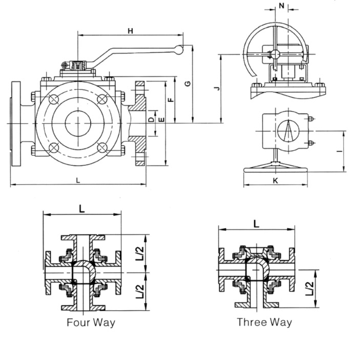 四面座三通四通球閥具有結構緊湊,密封性能號的特點,有"T"、"L"和"X"型,可實現對介質流向進行切換兩種工況。"L"和"T"型可實現對介質的分流或混流,各種工況可配備的驅動方式有手動,氣功,彈簧復位,電動等。